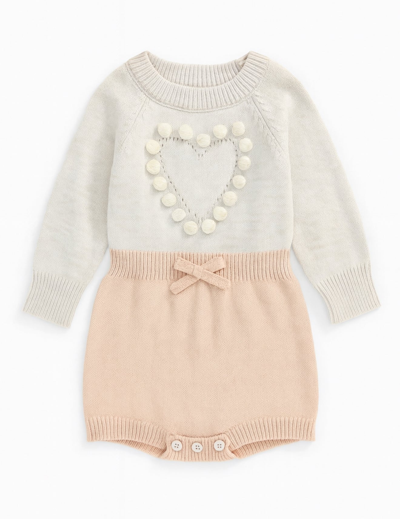 Soft and timeless, this knitted romper features a charming round neckline paired with intricate pearl embroidery Perfect for keeping her warm in effortless style through autumn and winter. 🤍